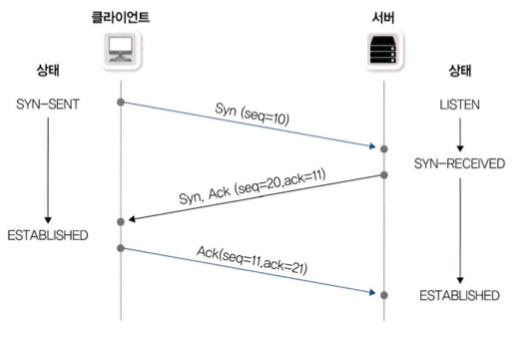 TCP는 패킷 유실이 발생하는지, 발생하지 않는지 테스트하기 위해서 미리 확인하는 과정을 거치는데, 3번의 패킷을 주고 받으며 통신을 준비하는 것을 3-way handshake라고 말합니다.