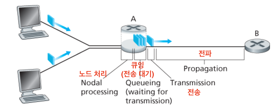 효율적으로 사용이 가능한 반면에, 각 패킷이 다른 경로를 통해 전달되기 때문에 지연 시간이 각 패킷마다 다르기도 합니다. 지연 종류에는 대표적으로 4가지가 존재하는데,